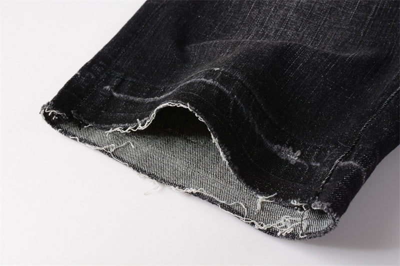 Regular fit, mid rise, relaxed tapered leg, belt loops, branded hardware, contrast stitching, all-over distressed panels and abstract pattern, partially lined